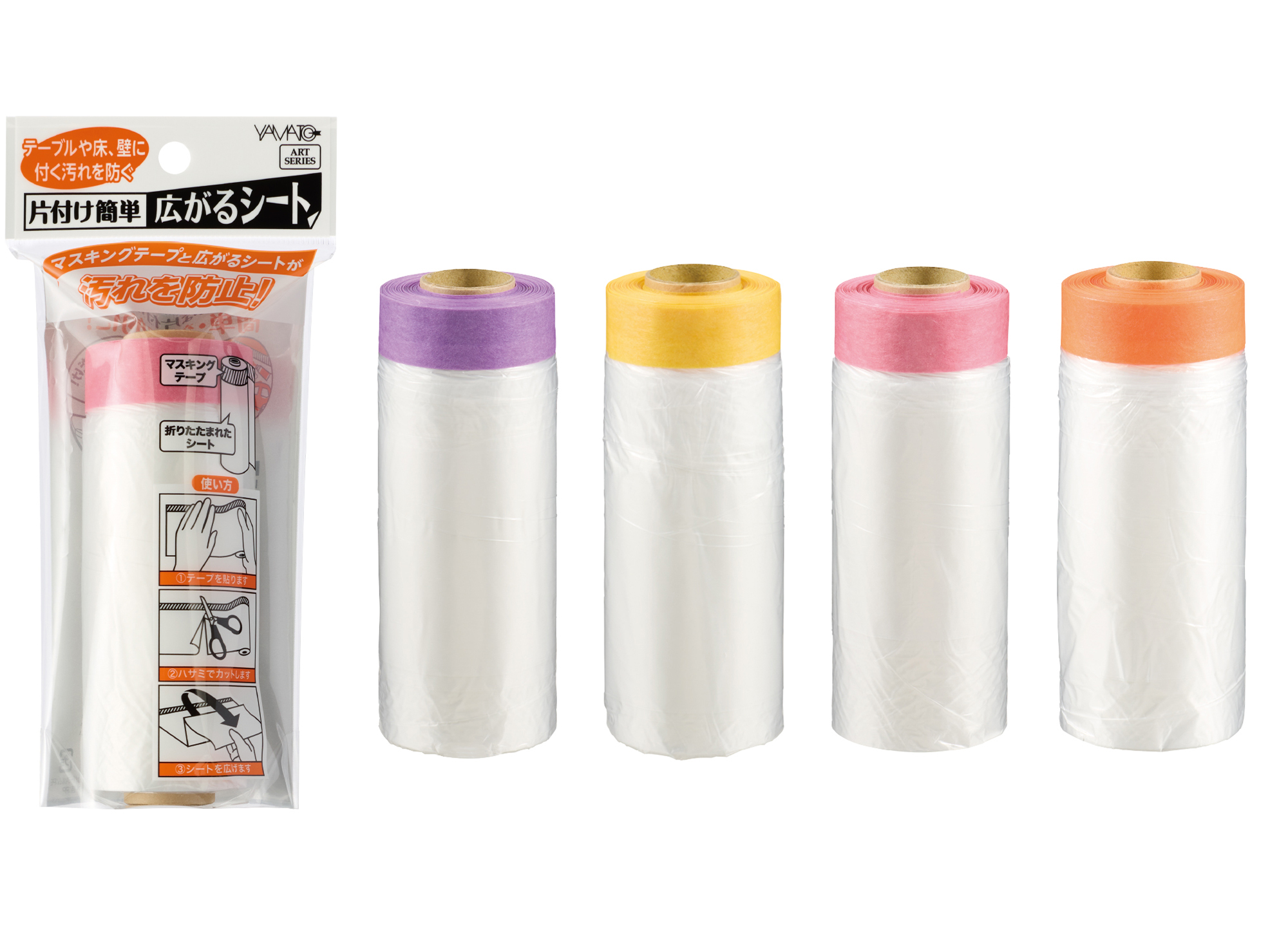 「片付け簡単広がるシート」は、マスキングテープと折りたたまれた養生シートが一体になった汚れ防止専用シートです。
