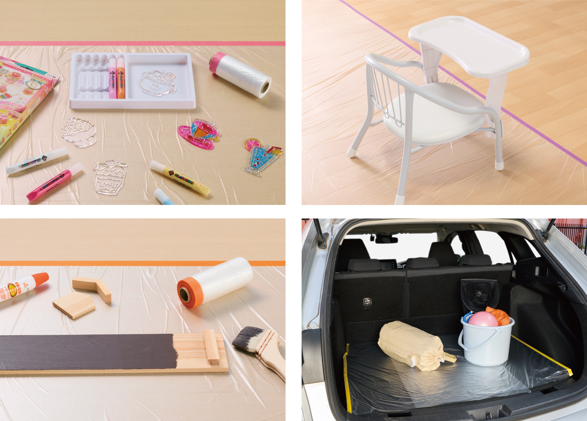 主な用途として、お子様のお絵描きや工作、DIY作業での汚れ防止、お子様の食べこぼしや散髪時などの家庭での利用の他、外出時は車内などでのおむつ替えやペットの抜け毛などによる汚れ防止、キャンプなどのレジャーシーン等様々な場面で活躍します。