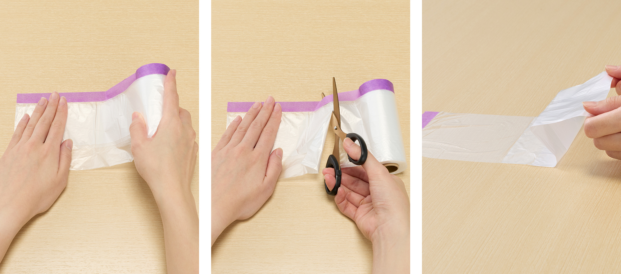 事前に汚れから保護したいテーブルや床、壁などにマスキングテープでシートを固定し、シートを広げることで汚れから守ります。