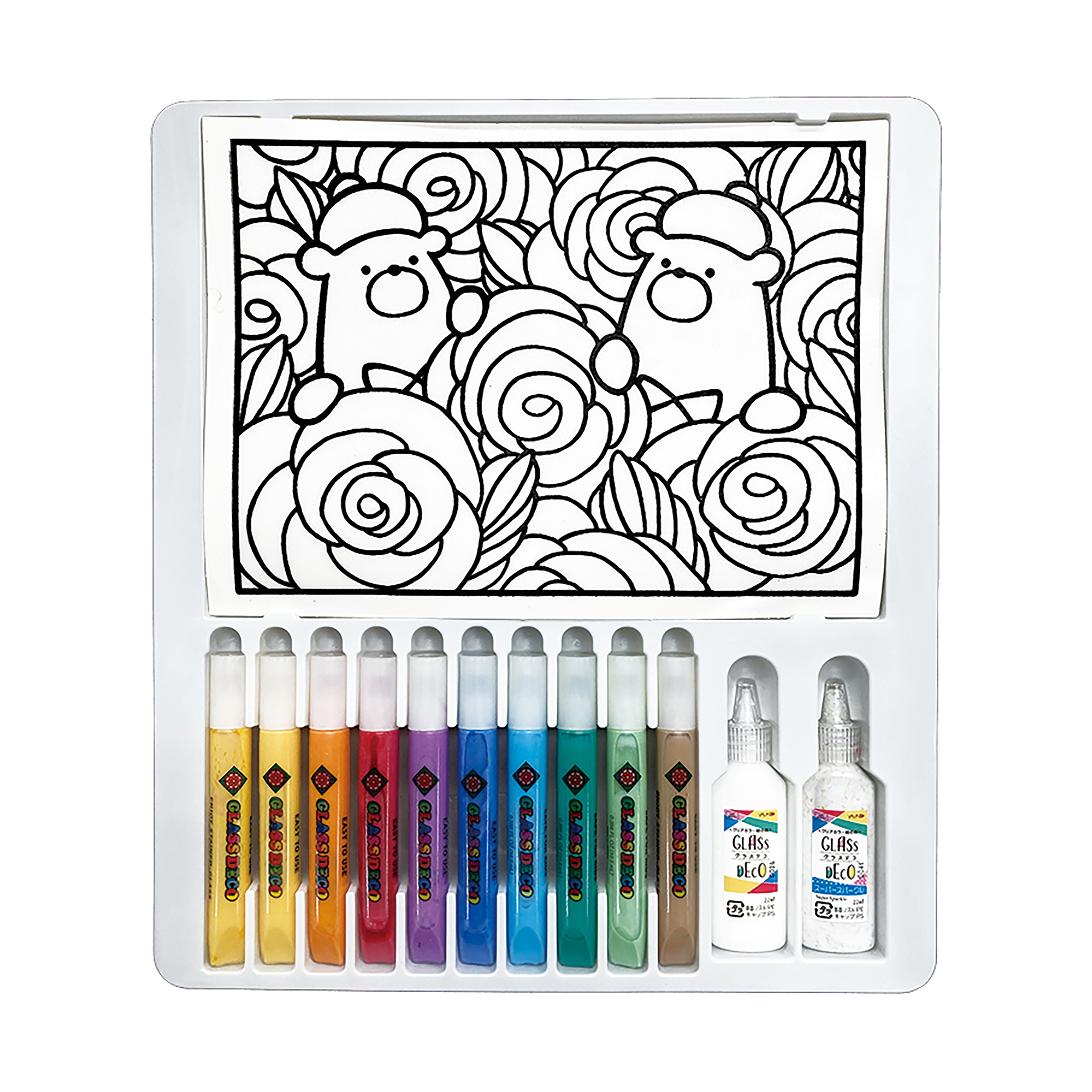 ステンドグラスのような、貼ってはがせるシールが作れる下絵入りシールとグラスデコのセットです。