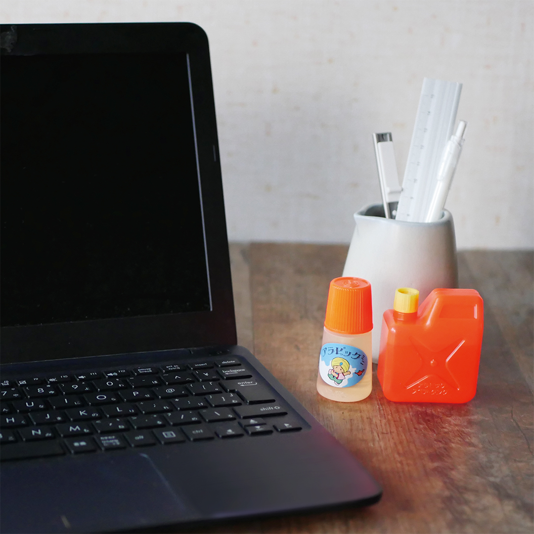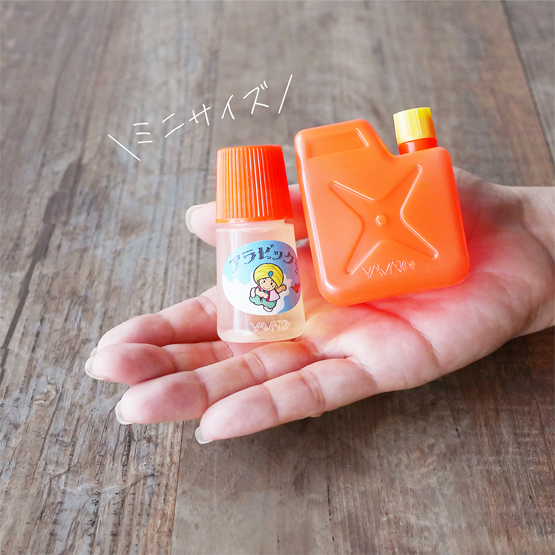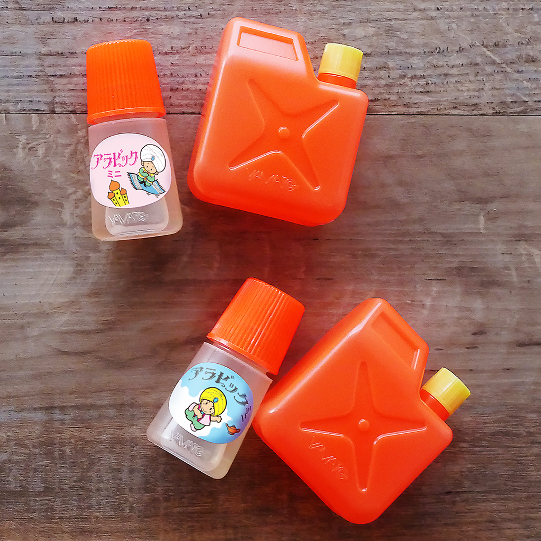 アラビア風の愛らしいキャラクターがデザインされている「アラビックミニ」に加え、ミニサイズのかわいいポリタンクには、補充用の液状のりが入っており、昭和の世界観を味わいながら補充作業も楽しんでいただけるセットになっています。